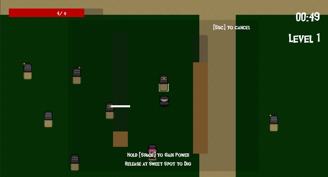 You play as Rob, a graverobber who is seeking wealth beyond his wildest dreams. Your goal is to raid graveyards, dig deep into the many graves, grab as much treasure as possible from the graveyard and escape through the north, south, east, or west exits before the timer runs out. If the timer runs out before you escape, the police will arrive and arrest you, confiscating all your treasure. You must then restart from square one, with no money, skills, or treasure. You must also fight off hordes of zombies who are looking to bring you into their ranks. Being slain by zombies or caught by the police means you will have to restart from the very beginning! However, each time you escape, you may use your money to upgrade certain skills which will aid you in future runs. And of course, the game gets more difficult with each level you reach. Good luck, and happy hunting!
